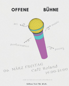 Du möchtest mit uns ein Konzert, eine Ausstellung oder Kulturveranstaltung organisieren? Deine Kunst hat es verdient an unseren Wänden oder auf unserer Bühne präsentiert zu werden? Dann melde Dich gerne unter kulturevents@caferoland.de bei uns!